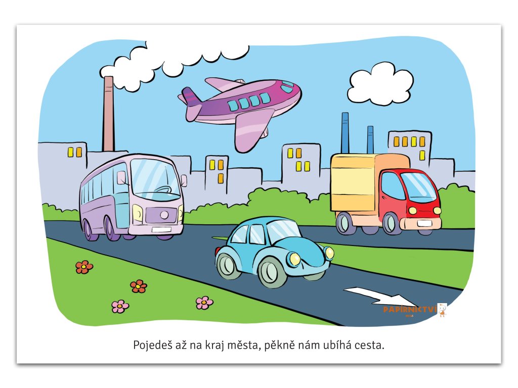 Klasické omalovánky s 8 obrázky dopravních prostředků, doplněné krátkými říkankami, které si děti snadno naučí a zapamatují. Budou si hrát, cvičit jemnou motoriku a paměť.
