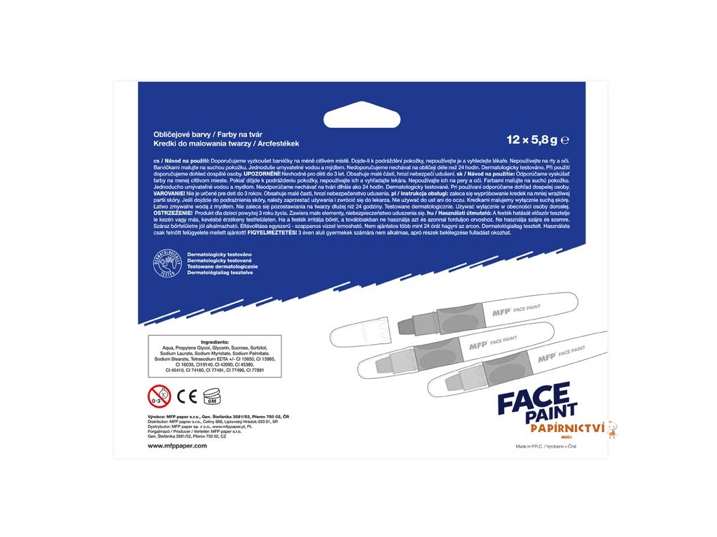 Barva na obličej bílá, na principu rtěnky (6 g). Díky těmto pestrým barvám vykouzlíte na tváři dítěte krásnou masku na karneval, párty nebo jinou oslavu. Dermatologicky testováno.