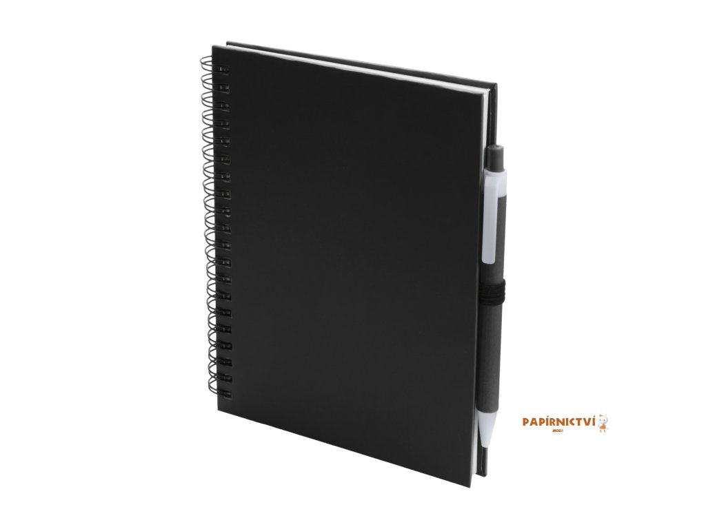 Poznámkový blok A5 se 70 čistými listy a spirálovou vazbou v kartonových deskách, vč. stejně barevného kuličkového pera z recyklovaného papíru s modrou náplní.