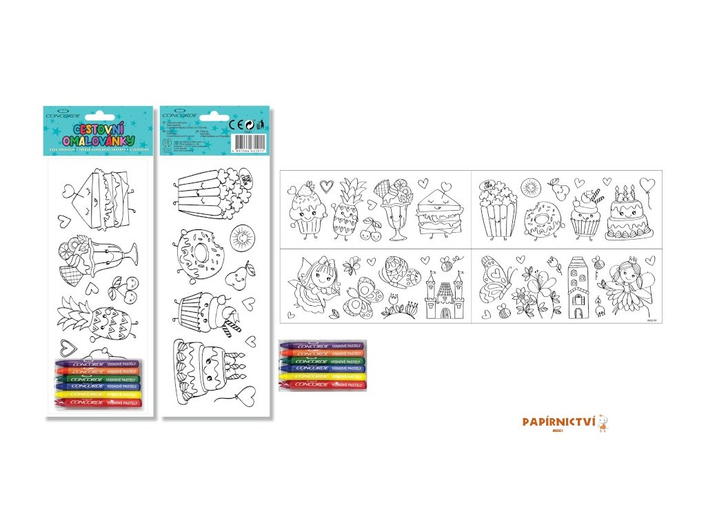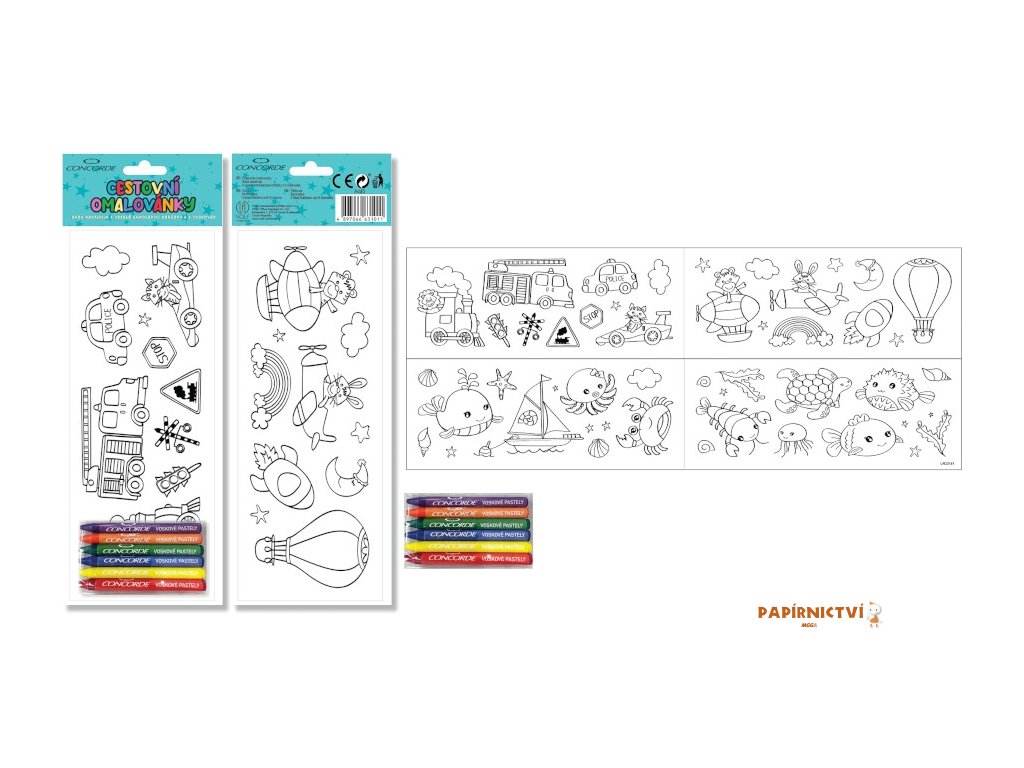 Cestovní samolepicí omalovánky. Tato sada obsahuje 4 veselé samolepicí obrázky a 6 voskovek. Díky svým kompaktním rozměrům 25x10 cm je tato sada ideální pro cestování, jelikož nezabere mnoho místa. Obrázky lze také jednoduše vystřihnout a nalepit kamkoliv jako umělecké dílo.