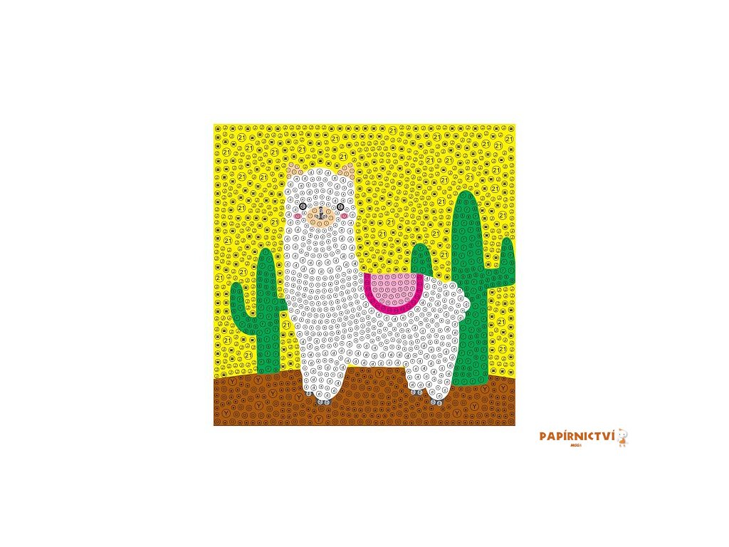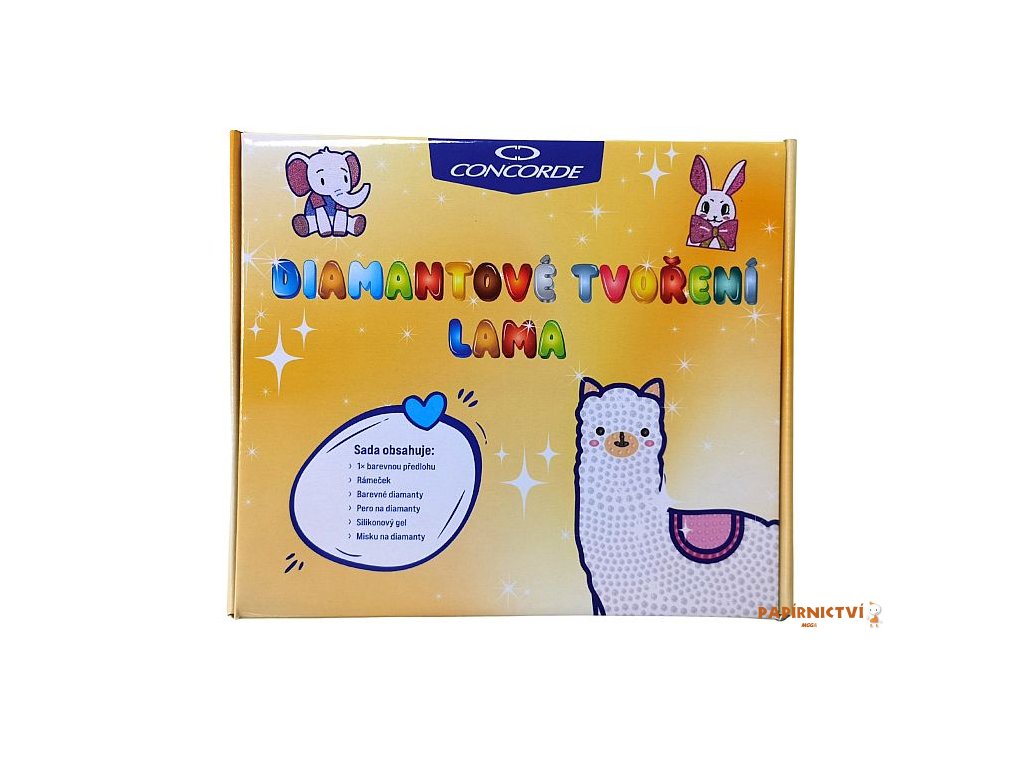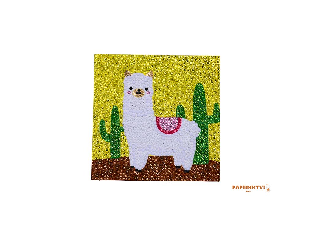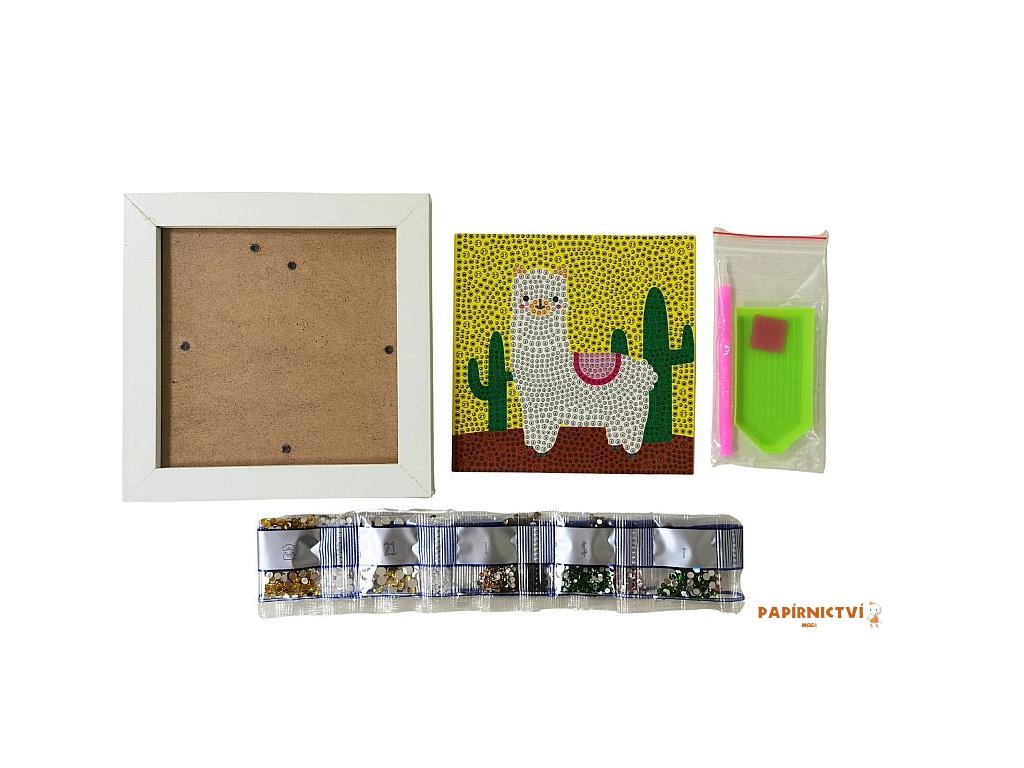 Diamantové tvorení s motivem lamy obsahuje barevnou predlohu, bílý rámecek, barevné diamanty, pero na aplikaci diamantu, silikonový gel a misku. Po odlepení pruhledné ochranné fólie ze šablony se pomocí aplikacního pera a silikonového gelu nanášejí diamanty na odpovídající místa. Tvorení podporuje jemnou motoriku, trpelivost a rozvíjí kreativitu. Hotový obrázek v rámecku se stane krásnou dekorací.