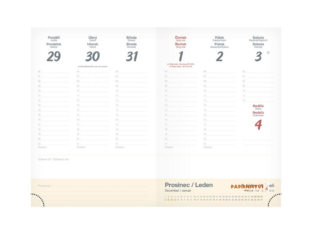 Uvnitř najdete praktické týdenní rozvržení na jedné dvojstraně, ideální pro přehledné plánování pracovních i osobních aktivit. Odtrhávací spodní rožky usnadňují rychlou orientaci – vždy snadno nalistujete aktuální týden.