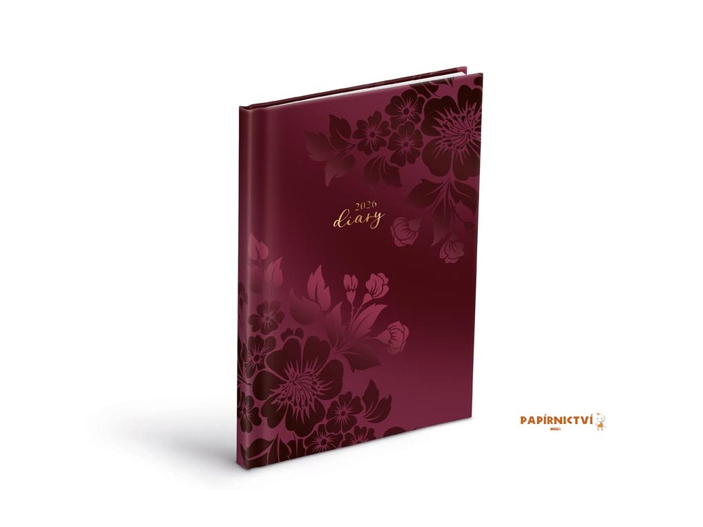 Týdenní diář ve formátu A5 pro rok 2026 zaujme na první pohled – sytě vínová obálka s květinovým vzorem a matným laminem s parciálním lakem vytváří elegantní kombinaci matného povrchu a lesklých detailů, které působí luxusně a zároveň decentně.