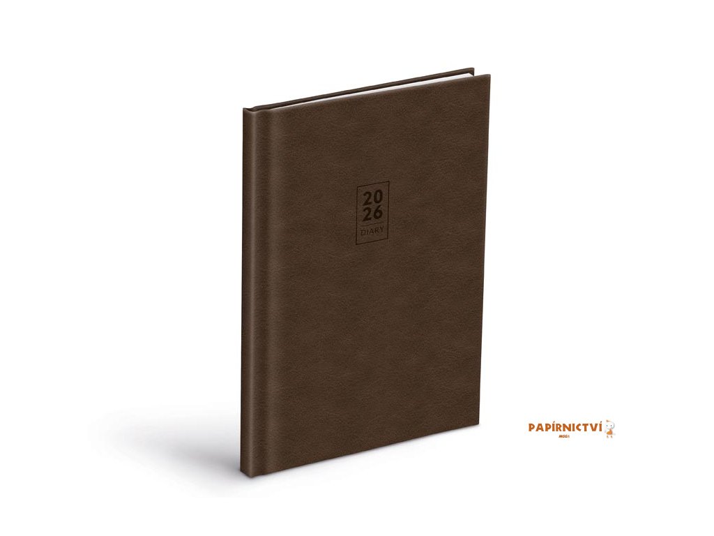 Tento týdenní diář ve formátu A5 zaujme svým čistým, uhlazeným vzhledem a tmavě hnědou obálkou v matném provedení. Moderní a zároveň nadčasové pojetí podtrhuje decentní ražba s letopočtem „2026“ a nápisem „DIARY“, zapuštěná přímo do povrchu – bez lesku, bez ozdob, jen jasná funkce a estetika.