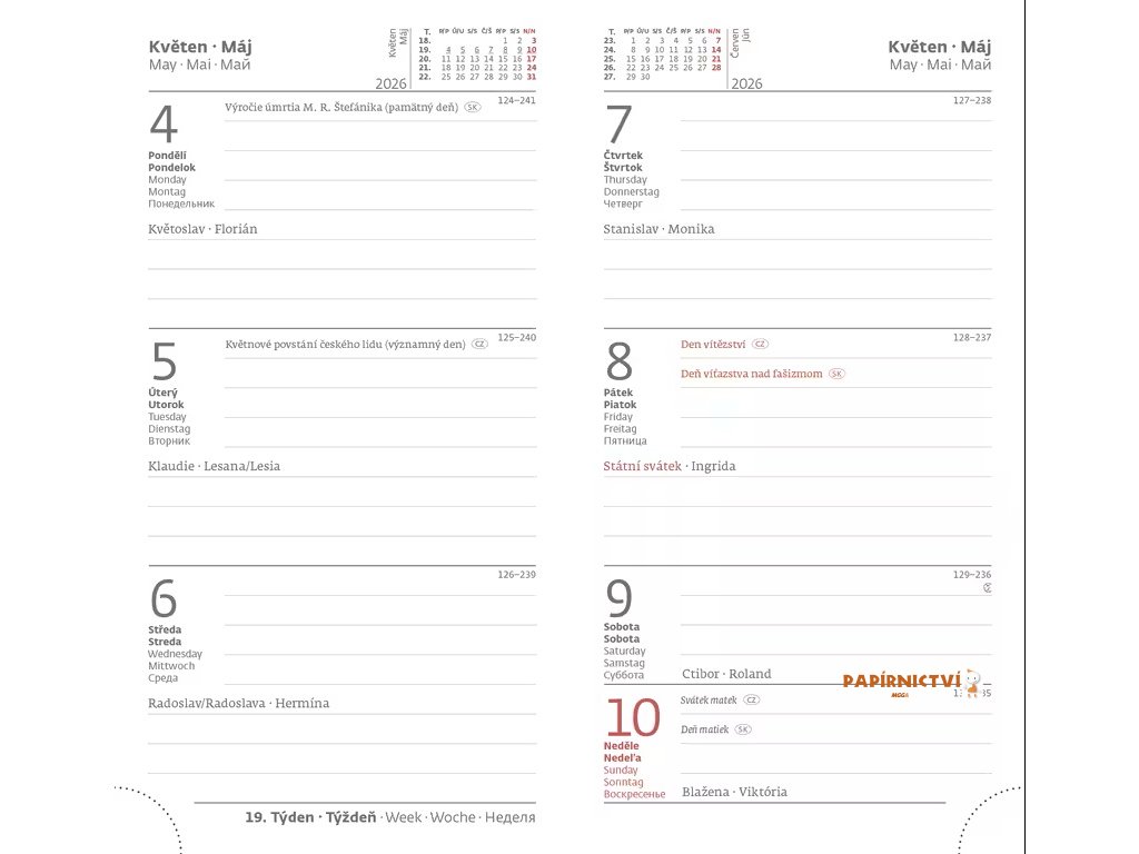 Diář obsahuje: osobní údaje, plánovač dovolené (měsíční přehled), plánovací kalendář, mezinárodní svátky, roční výhled, týdenní layout, adresář