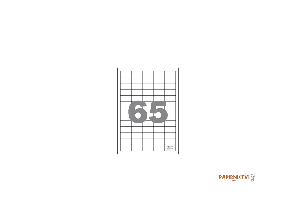 Kancelářské samolepicí etikety - univerzální pro inkoustové, laserové tiskárny a kopírovací zařízení. Etikety jsou vyrobeny násekem archu A4. Rozměr etikety: 38 × 21,2 mm. Etiket v balení: 6500 ks. Balení: 100 archů/krabice.