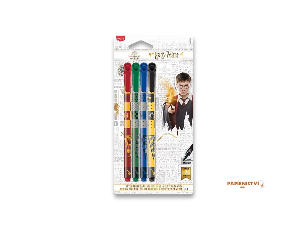 Souprava 4 barev barevných fixů s motivy Harry Potter. Fixy mají odolný hrot a snadno vypratelný a omyvatelný inkoust.