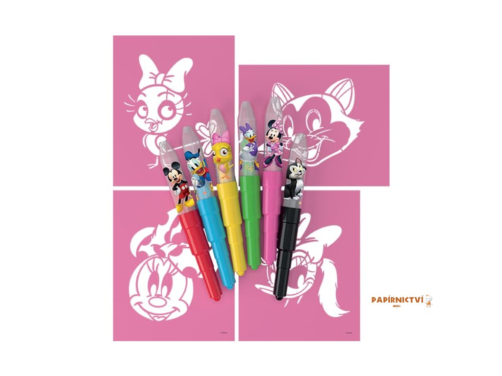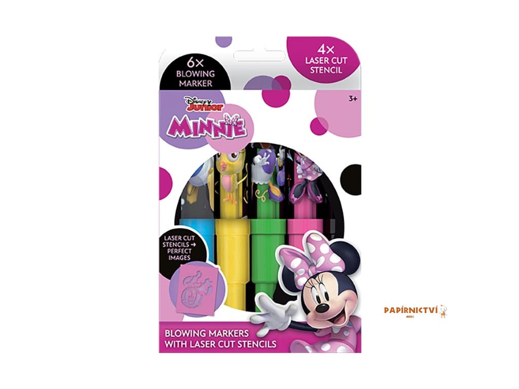 Balení obsahuje 6 barevných foukacích fixů s potiskem a 4 barevné papírové šablonky v oblíbených pohádkových motivech.