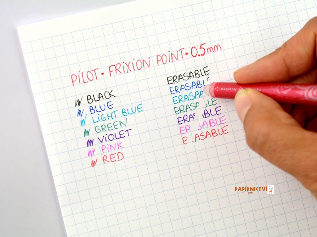 Vysoce přesný hrot FriXion - napiš, vygumuj, přepiš! Bezproblémově zapíšete s rollerem FriXion s přesným jehličkových hrotem. Text vygumujte třením speciální gumy FriXion bez poškození papíru a okamžitě přepiště. Použijte roller FriXion Point s patentovaným termosenzitivním inkoustem, se kterým - jako již tradičně - přináší Pilot revoluci v psaní! Má mladistvý vzhled s designem tetování a je dodáván v sedmi barvách. Nepoužívejte k podepisování oficiálních dokumentů, u právních dokumentů, při zkouškách nebo při práci s jinými dokumenty, jejichž obsah musí mít trvalý charakter.