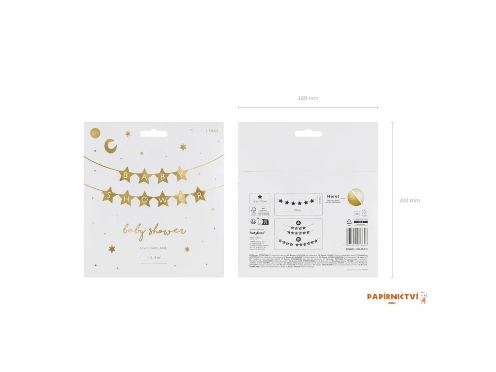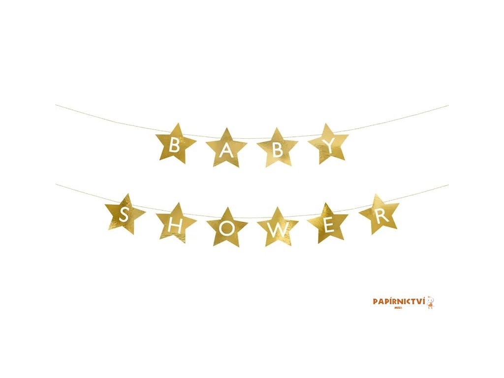 Banner ve tvaru hvězdy s nápisem "Baby Shower" z papíru zlaté barvy, rozměry šňůrky cca 3m.