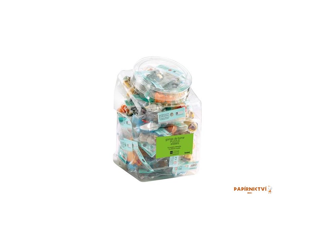 Zábavné pryže ve stylu puzzle s motivy zvířátek, autíček a různých figurek.