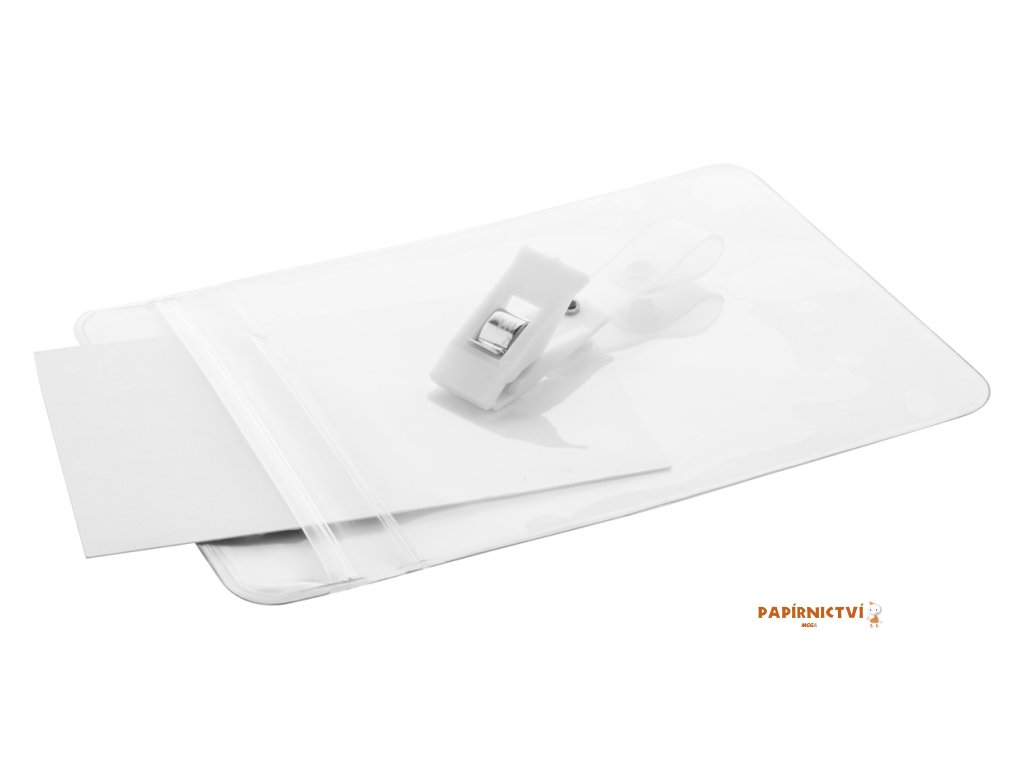 Transparentní plastová identifikační visačka s klipem, či k lanyardu.