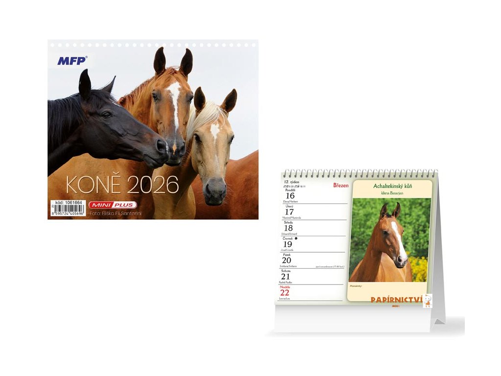 Stolní kalendář na rok 2026 mini s názvem Koně. Kalendář je určený pro milovnice a milovníky koní. Vhodný pro zapisování důležitých poznámek, k organizování různých událostí každodenního života. Možnost dotisku firemního loga a textu na spodní stranu kalendáře.