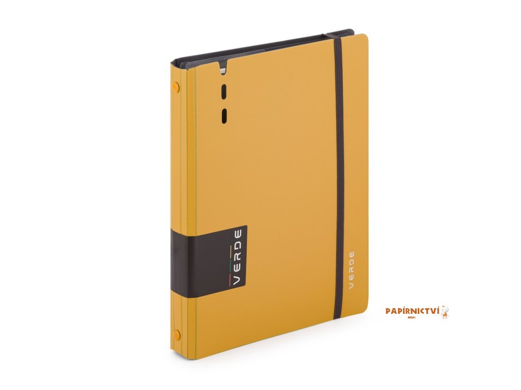 Karis blok z kolekce Verde: funkční a stylový čtyřkroužkový blok ve velikosti A5, vyrobený z odolného materiálu foam v hořčicové barvě. Tento blok nabízí praktické rozřaďovače a vnitřní náplň: 30 stran linka, 30 stran tečka, 30 stran čisté (bez potisku). S uzavíráním na elastickou gumičku a kapsami pro vizitky.