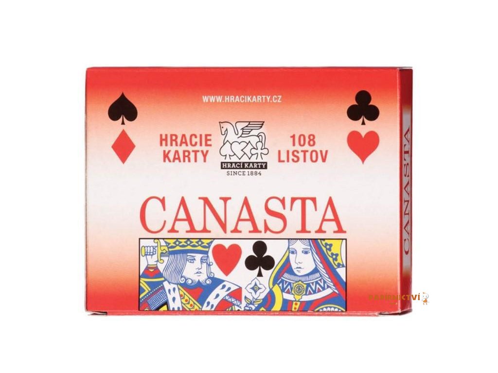 Klasické canastové karty v papírové krabičce, revers krajka modrá a červená, rozměry: 57 x 87 mm, 108 listů.