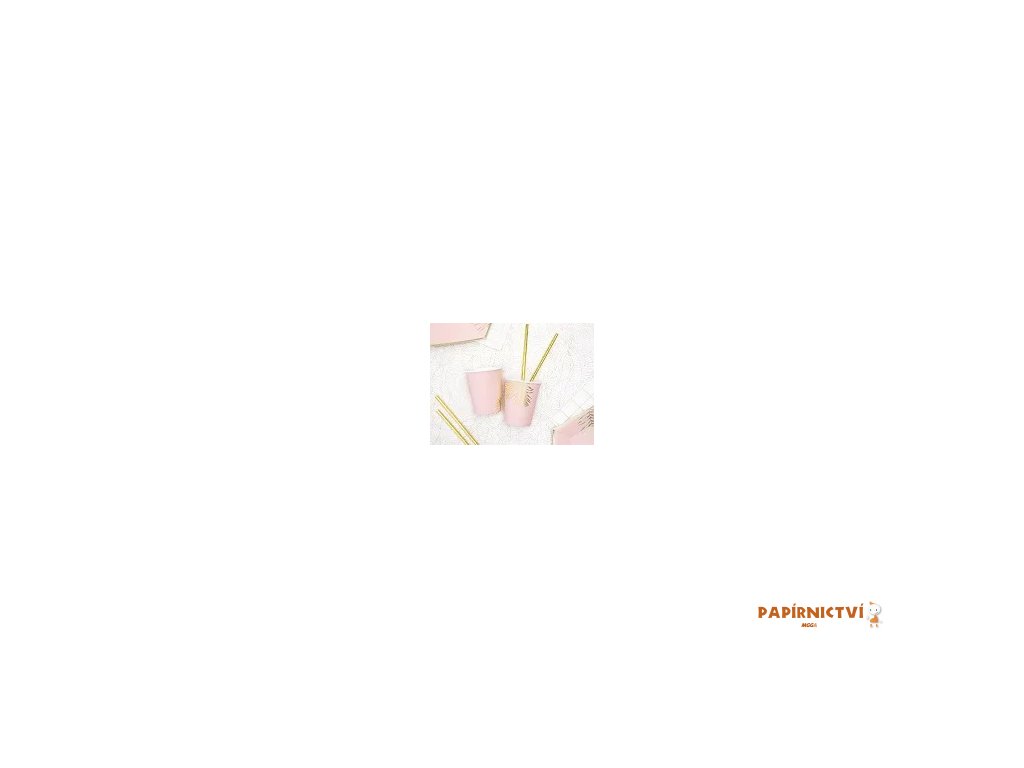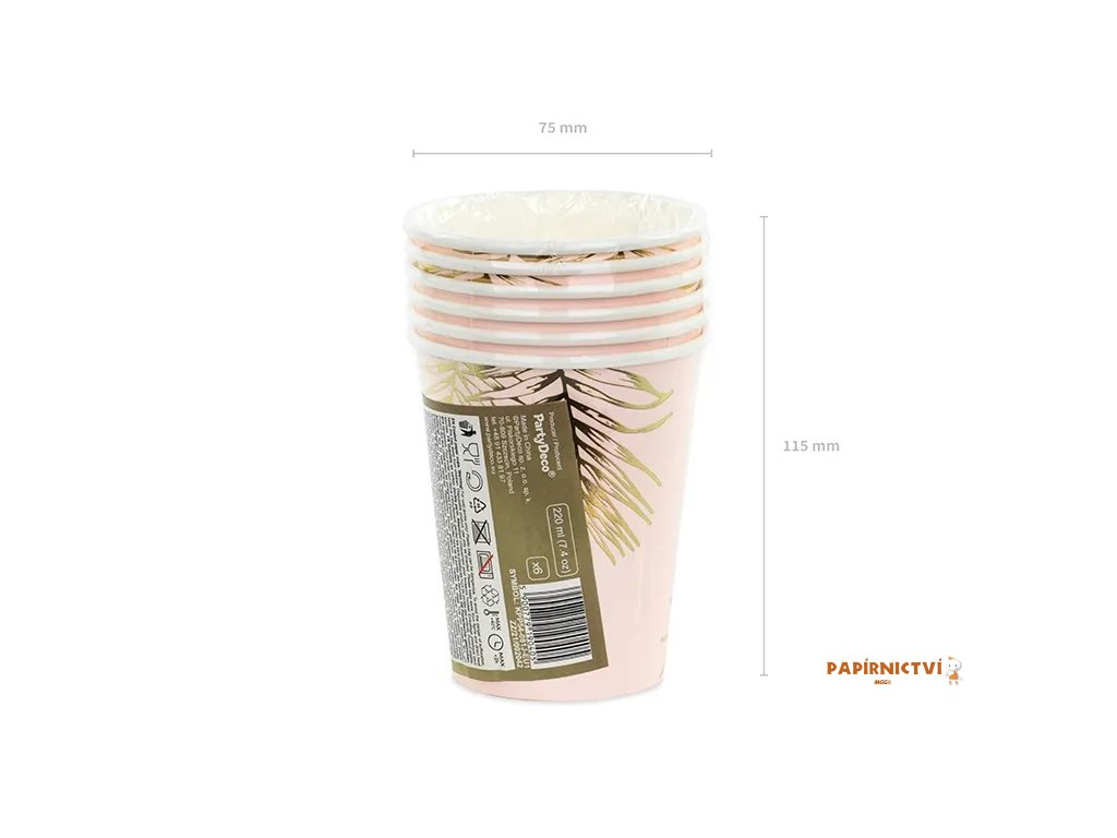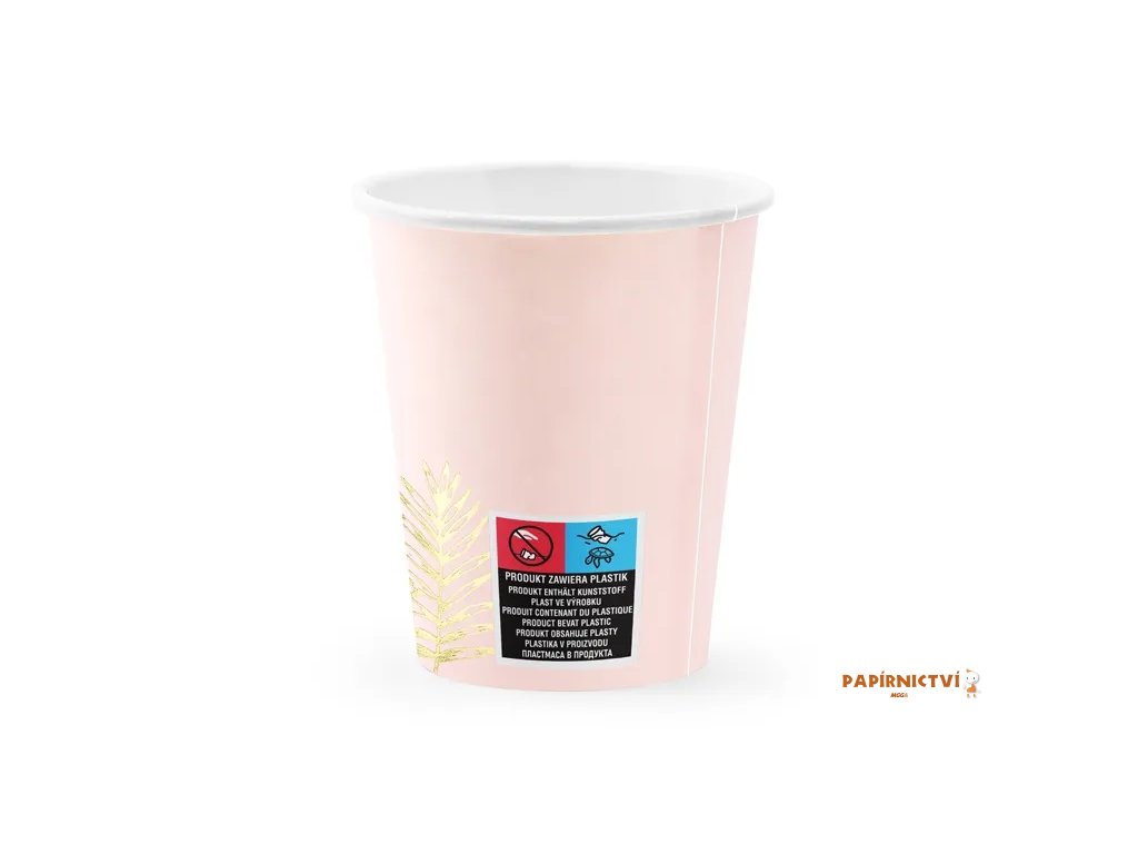 Papírové kelímky světle růžové barvy se vzorem zlatých lístků.