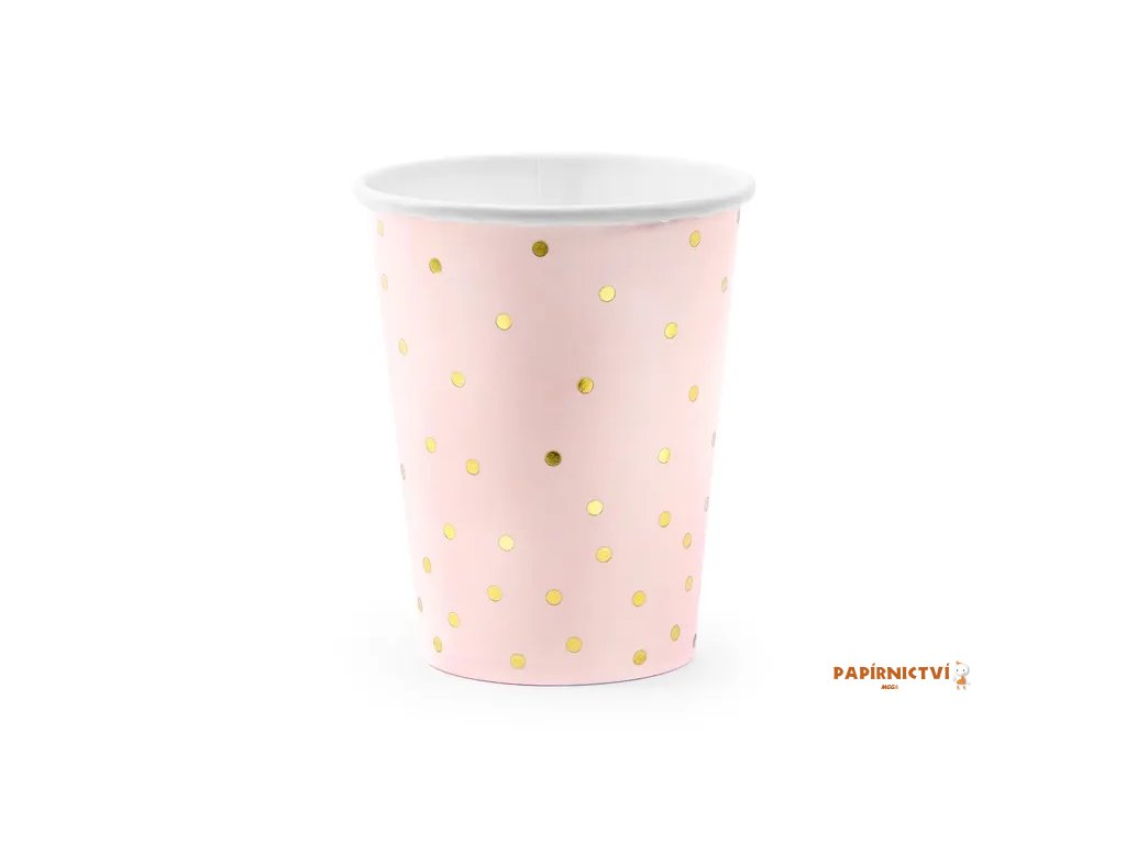 Papírové kelímky světle růžové barvy se zlatým tečkovaným vzorem.