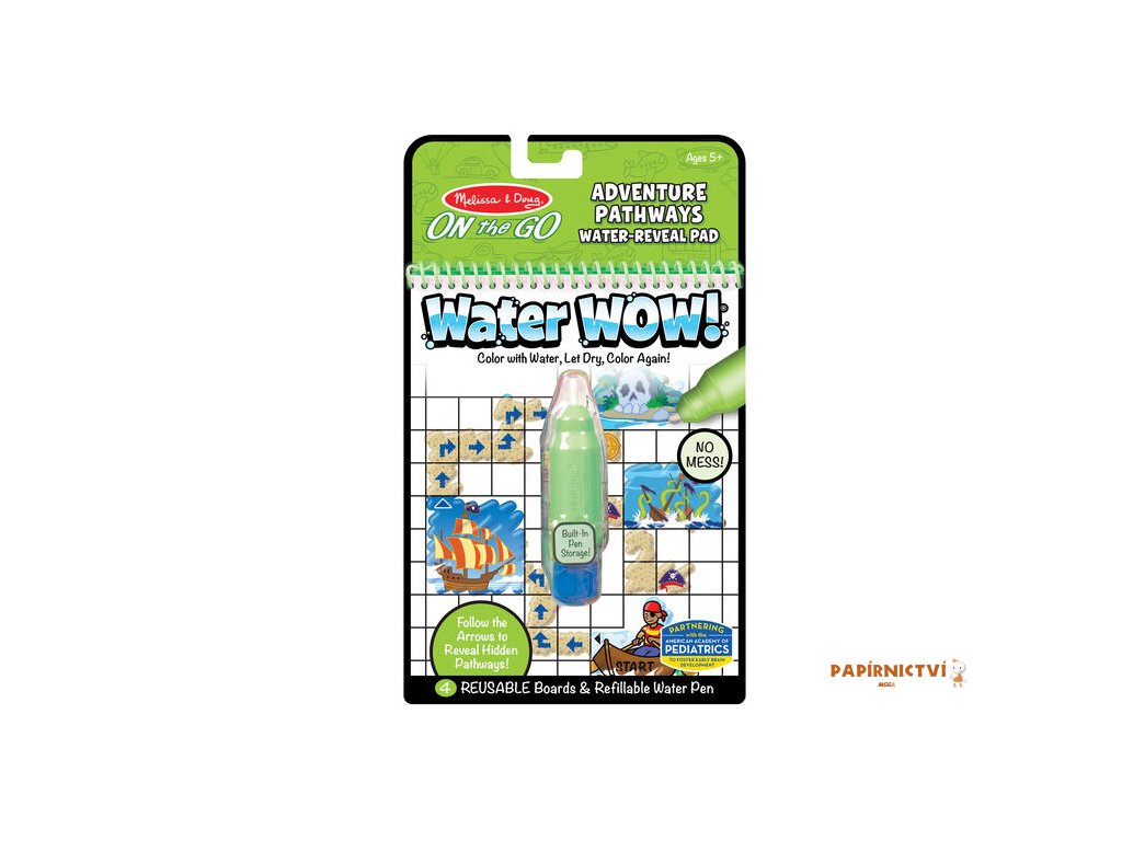 Kouzlení vodou Dobrodružství - Čisté malování! Tyto "vodní" omalovánky obsahují čtyři znovupoužitelné stránky a znovuplnitelné vodní pero. Použijte vodní pero, jehož tahy se zobrazí živé barvy na jednotlivých obrázcích. Potom nechte stránku usušit a obrázek opět zmizí a znovu po navlhčení objeví. Vodní pero se snadno drží a vkládá se do úložné schránky na přední straně omalovánky, což činí Water WOW pratickou omalovánkou i pro cestování.