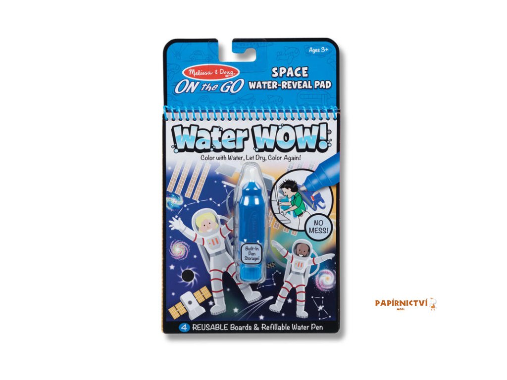 Kouzlení vodou Vesmír - Čisté malování! Tyto "vodní" omalovánky obsahují čtyři znovupoužitelné stránky a znovuplnitelné vodní pero. Použijte vodní pero, jehož tahy se zobrazí živé barvy na jednotlivých obrázcích. Potom nechte stránku usušit a obrázek opět zmizí a znovu po navlhčení objeví. Vodní pero se snadno drží a vkládá se do úložné schránky na přední straně omalovánky, což činí Water WOW pratickou omalovánkou i pro cestování.