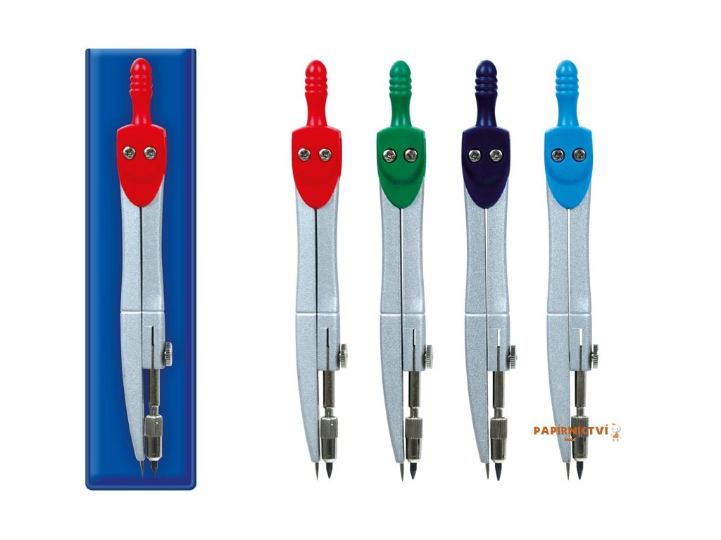 Univerzální kovové kružítko pro kružnice do průměru 34cm. Kružítko je uloženo v modrém plastovém pouzdru.