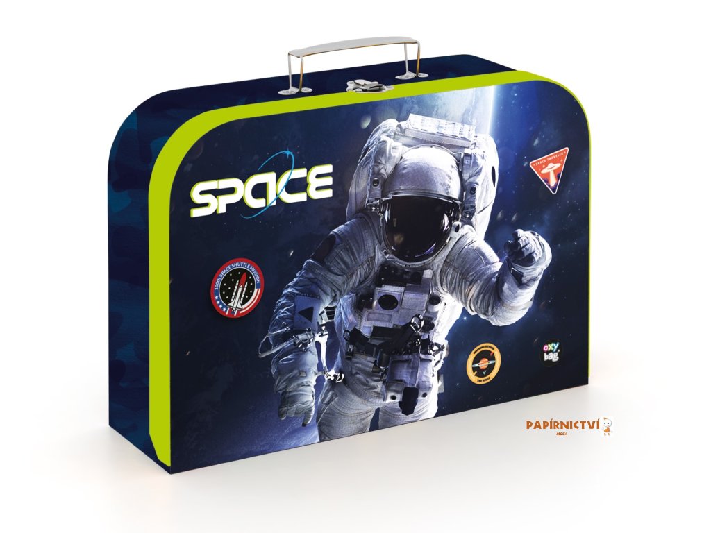 Lamino kufřík na výtvarnou výchovu. Do kufříku se vejde formát A4. Materiál: papír, lepenka, kovový zámeček, kovové nýty.