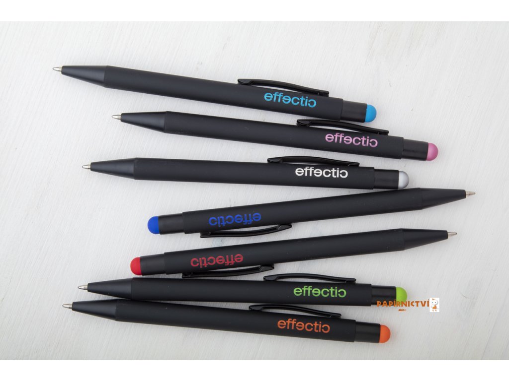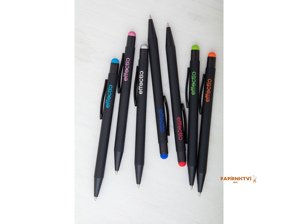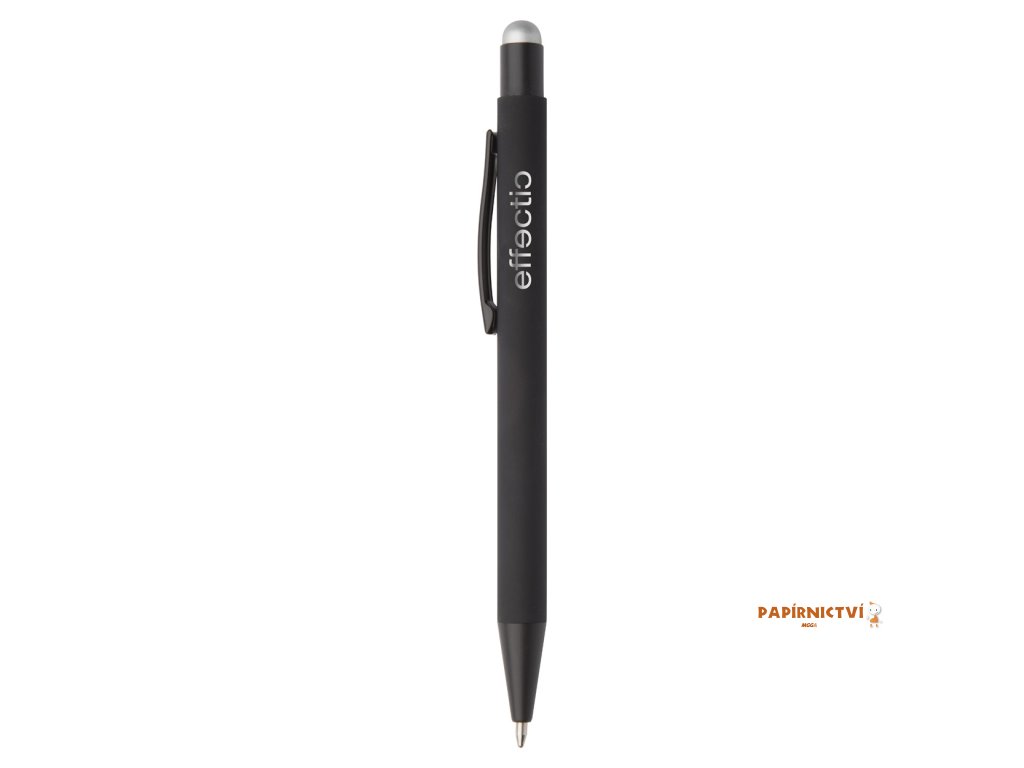Hliníkové kuličkové a dotykové pero s pogumovanou úpravou a speciálním povrchem pro zrcadlový laser v barvě stylusu, s modrou náplní.