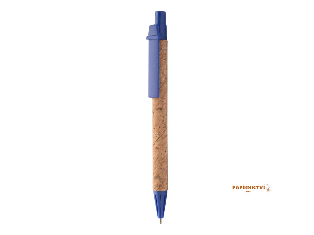 Kuličkové pero z recyklovaného papíru s korkovým povrchem a plastovými částmi, s modrou náplní.