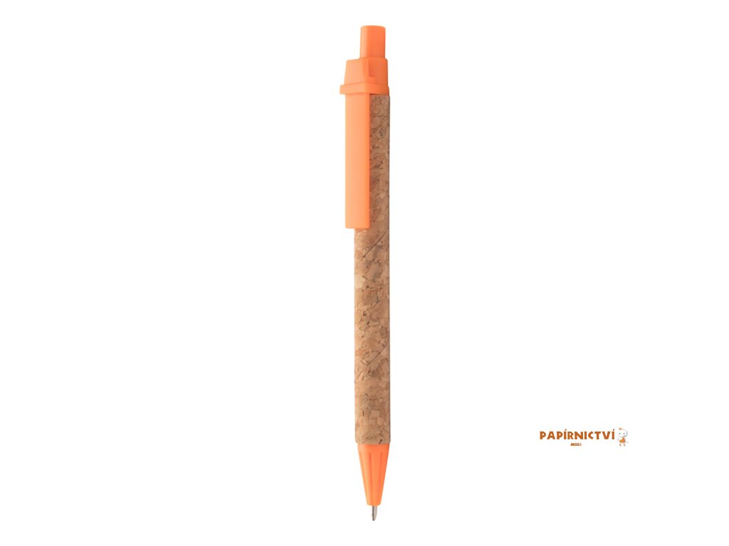 Kuličkové pero z recyklovaného papíru s korkovým povrchem a plastovými částmi, s modrou náplní.