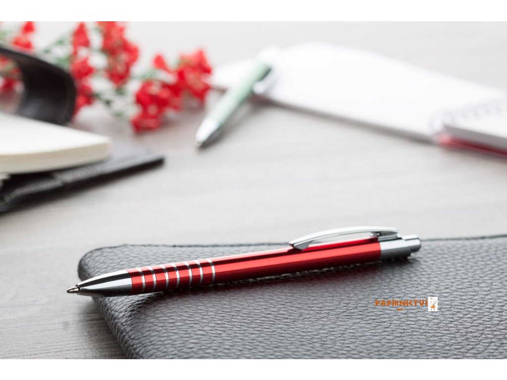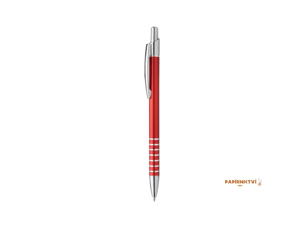 Hliníkové kuličkové pero s kovovým klipem a chromovanou špičkou a vrškem. Dodává se s modrou náplní.