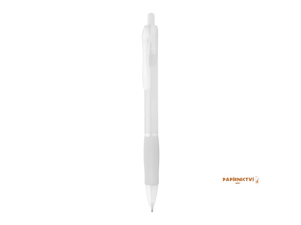 Plastové kuličkové pero s pogumovaným gripem a s modrou náplní.