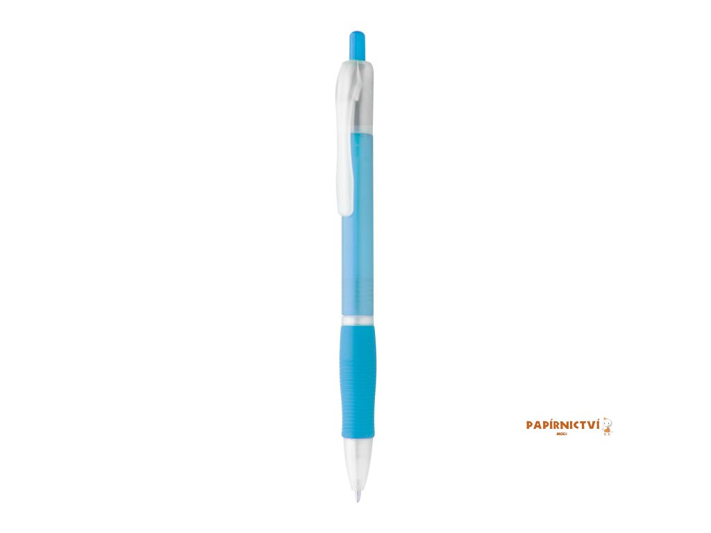 Plastové kuličkové pero s pogumovaným gripem a s modrou náplní.