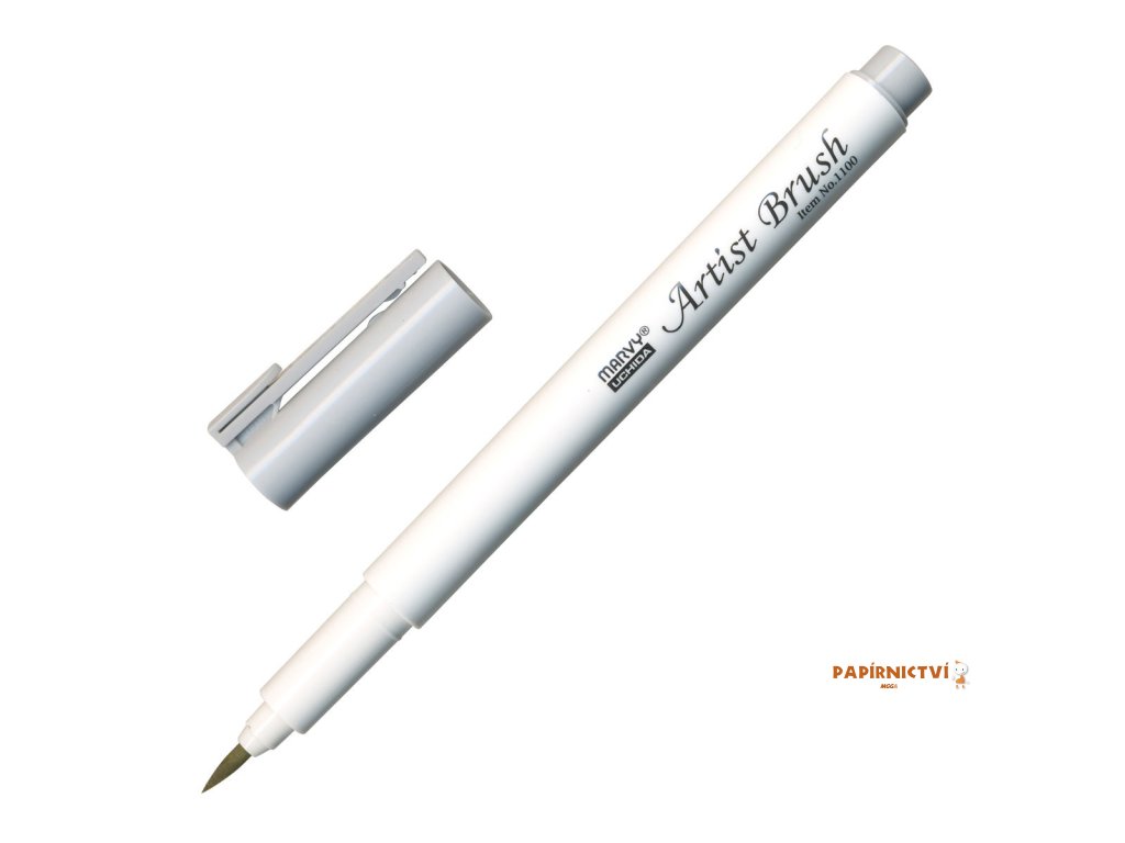 barva stříbrně šedá • popisovač Marvy 1100 Artist Brush se štětcovým hrotem je rozmývatelný vodou • obsahuje barevný inkoust na vodní bázi • vhodný na vybarvování obrázků, otisků razítek (natištěných permanentním inkoustem), ilustrace • flexibilní štětcový hrot umožňuje vytvářet tenké i tlusté linky • barvy lze vzájemně propojovat • netoxický, bez kyseliny