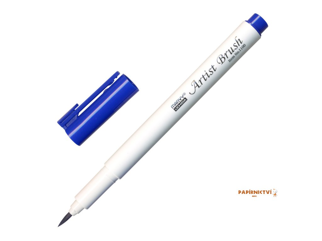 barva modrá • popisovač Marvy 1100 Artist Brush se štětcovým hrotem je rozmývatelný vodou • obsahuje barevný inkoust na vodní bázi • vhodný na vybarvování obrázků, otisků razítek (natištěných permanentním inkoustem), ilustrace • flexibilní štětcový hrot umožňuje vytvářet tenké i tlusté linky • barvy lze vzájemně propojovat • netoxický, bez kyseliny