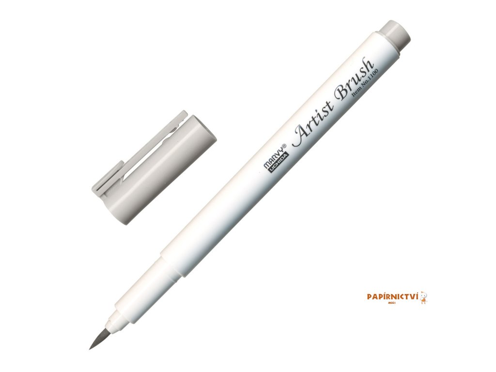 barva světle šedá • popisovač Marvy 1100 Artist Brush se štětcovým hrotem je rozmývatelný vodou • obsahuje barevný inkoust na vodní bázi • vhodný na vybarvování obrázků, otisků razítek (natištěných permanentním inkoustem), ilustrace • flexibilní štětcový hrot umožňuje vytvářet tenké i tlusté linky • barvy lze vzájemně propojovat • netoxický, bez kyseliny