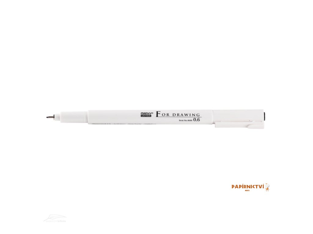 Marvy Uchida For Drawing pigmentový popisovač s odolnou špičkou hrotu • hrot se stopou 0,6 mm je odolný a je obtížné jej ohnout • vlákna hrotu zasazená v kovové objímce • pigmentový inkoust Marvy For Drawing na bázi vody, perfektní sytá stopa • při použití v komiksu jsou Marvy Uchida 4600 For Drawing 0,03 a 0,05 mm pro jemné linie, jako jsou oči a vlasy • tenké elegantní štíhlé tělo, hrot chráněný víčkem s plastovým klipem • na víčku i na těle označení síly popisovače • vhodné pro kresbu, sketch, komiksy, manga, lineaart • Marvy Uchida For Drawing 0,6 mm černý pigmentový inkoust • Marvy Uchida 4600 0,6