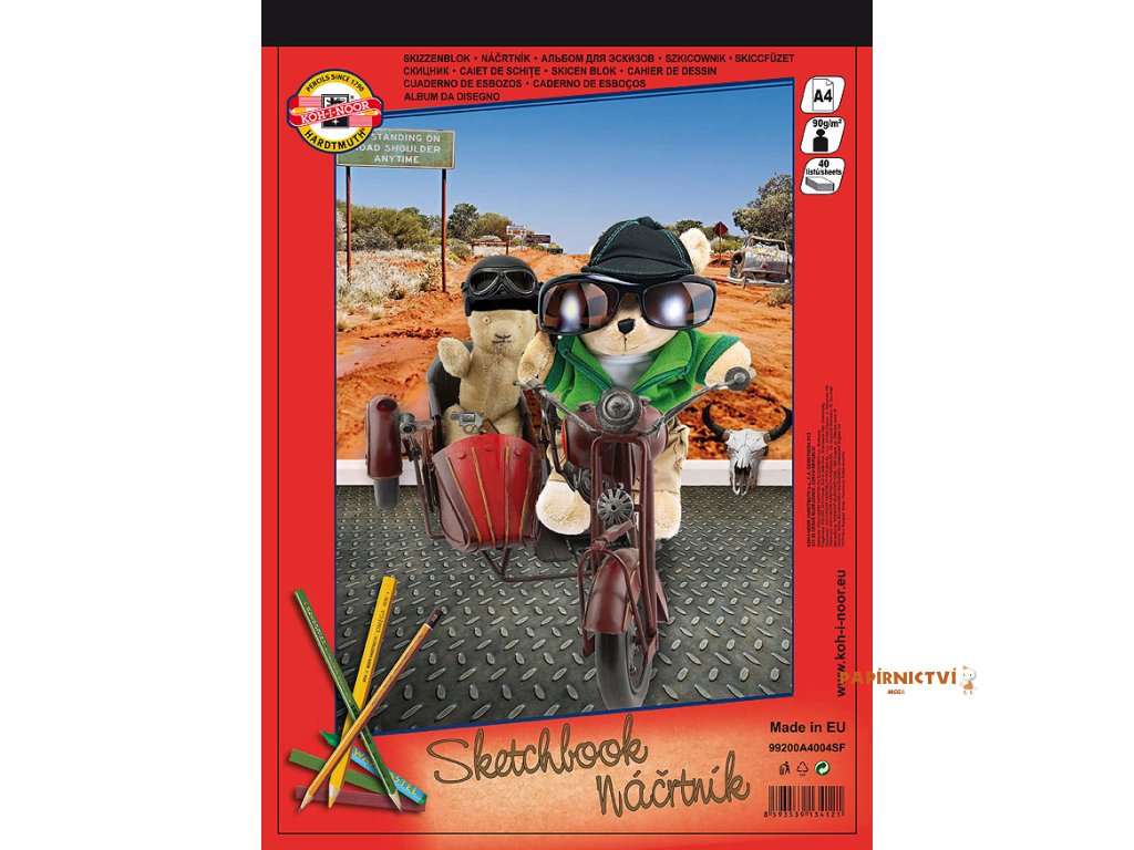Lepený blok – školní náčrtník pro pastelky, grafit. Tužky. Na přední obálce v horní části mašle, barevný motiv Plyšáci, formát A4 – 40 listů, 90 g/m2. Zadní část obálky: karton. Lepení v hlavě. Rozměr 297 x 210 x 6 mm.