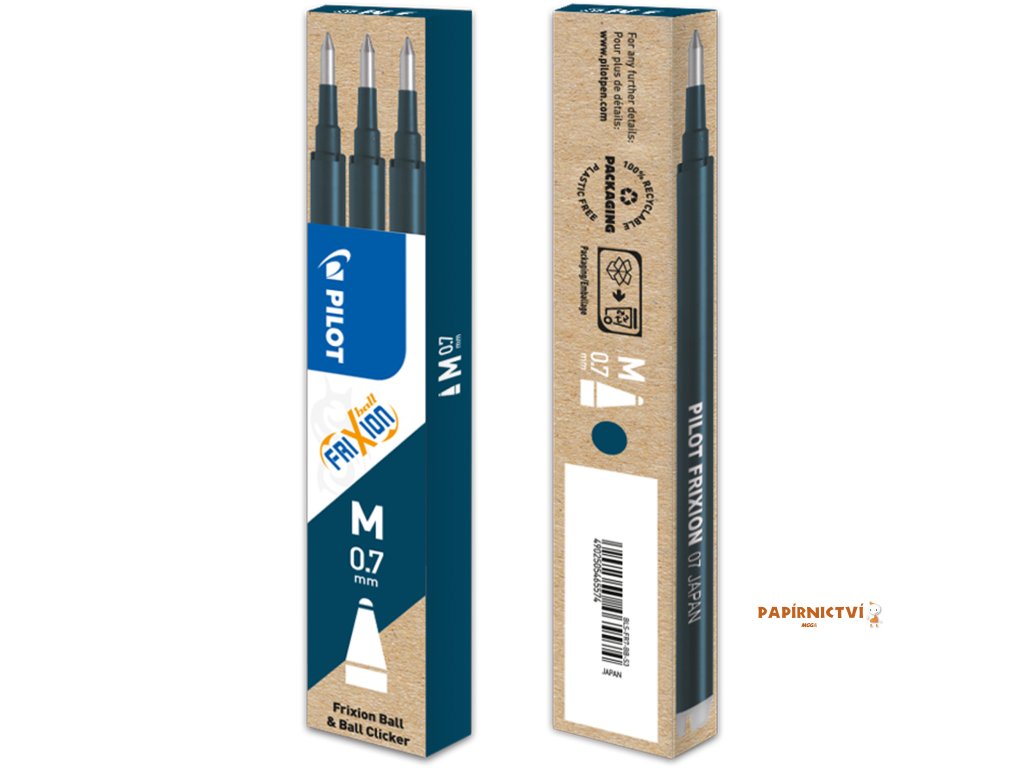 Sada 3 modročerných gelových náplní (hrot M) pro rollery Pilot: FriXion Ball, FriXion Slim, FriXion LX a FriXion Clicker.