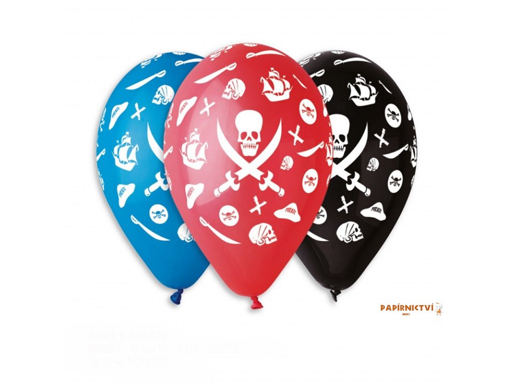 Nafukovací balónky s potiskem pirátů dodáváme v mixu modré, červené a černé barvy.