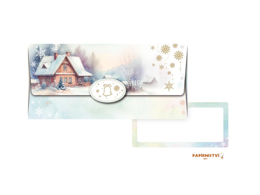 Vdechněte svým vánočním dárkům kouzlo tradice a elegance. Tato vánoční obálka s motivem zasněžené chaloupky a zlatými sněhovými vločkami je ideální pro slavnostní předání peněz, dárkového poukazu nebo vstupenek.