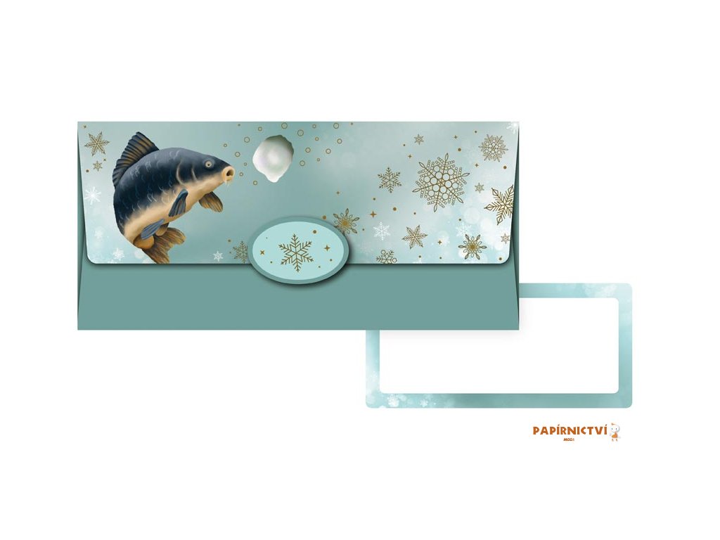Tato elegantní obálka na peníze s motivem kapra přináší tradiční atmosféru Vánoc v moderním a svěžím provedení. Kapr jako typický symbol českých svátků je zde doplněn jemnými sněhovými vločkami a decentními zlatými detaily na ledově modrém pozadí. Obálka je ideální pro předání finančního daru nebo dárkového poukazu.