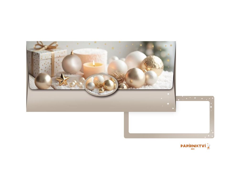 Tato elegantní obálka na peníze vnese do vašeho dárku noblesu a slavnostní atmosféru. Kombinace zlatých a perleťových ozdob, jemné světlo svíčky a decentní pozadí vytvářejí harmonický motiv plný klidu, tepla a očekávání. Obálka je ideální pro předání peněz, dárkového poukazu nebo osobního přání během vánočních svátků.