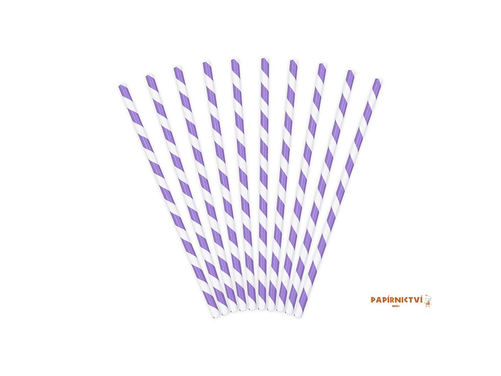 Lila papírová brčka s bílými diagonálními pruhy, délka cca 19,5 cm. Neobsahují plasty!