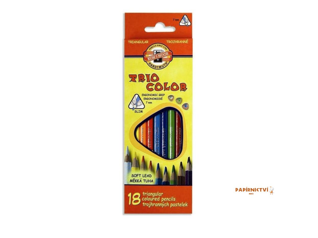Trojhranné pastelové tužky v dřevěném plášti. 18 barev baleno do kartonové krabičky. Ergonomický trojhranný tvar umožňuje optimální držení a vedení tužky. Jsou určeny jak pro školáky tak i děti předškolního věku. Tyto tužky získávají stále větší oblibu.