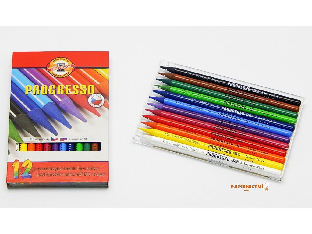Souprava 12 ks pastelových tužek v laku (PROGRESSO). Jsou bez dřevěného pláště a celý průřez je tvořen pastelovým jádrem. Pastelky se velice dobře hrotí a jsou určeny pro školní, hobby i umělecké kreslení. Vzhledem k svému průřezu jsou vhodné především pro vybarvování velkých ploch.