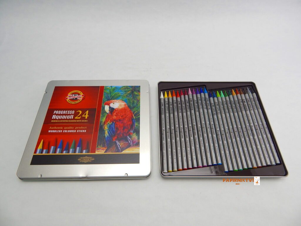 Souprava 24 ks akvarelových pastelových tužek v laku a balené v plechovém obalu. Výrobek je další řadou v oblíbené sérii PROGRESSO. Pastelové tužky v laku PROGRESSO Aquarell jsou bez dřevěného pláště. Oproti standardnímu výrobku je navíc možno kresbu rozmývat vodou. Je ho tedy možné použít i k akvarelové malbě a vhodný je pro hobby i umělecké kreslení.