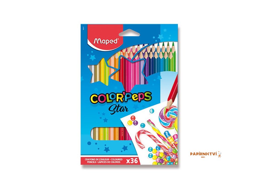 Soupravu 36 kusů pastelek s veselým designem. Ergonomické pastelky Maped Color'Peps mají trojhranné tělo, měkkou odolnou tuhu a jasné barvy.