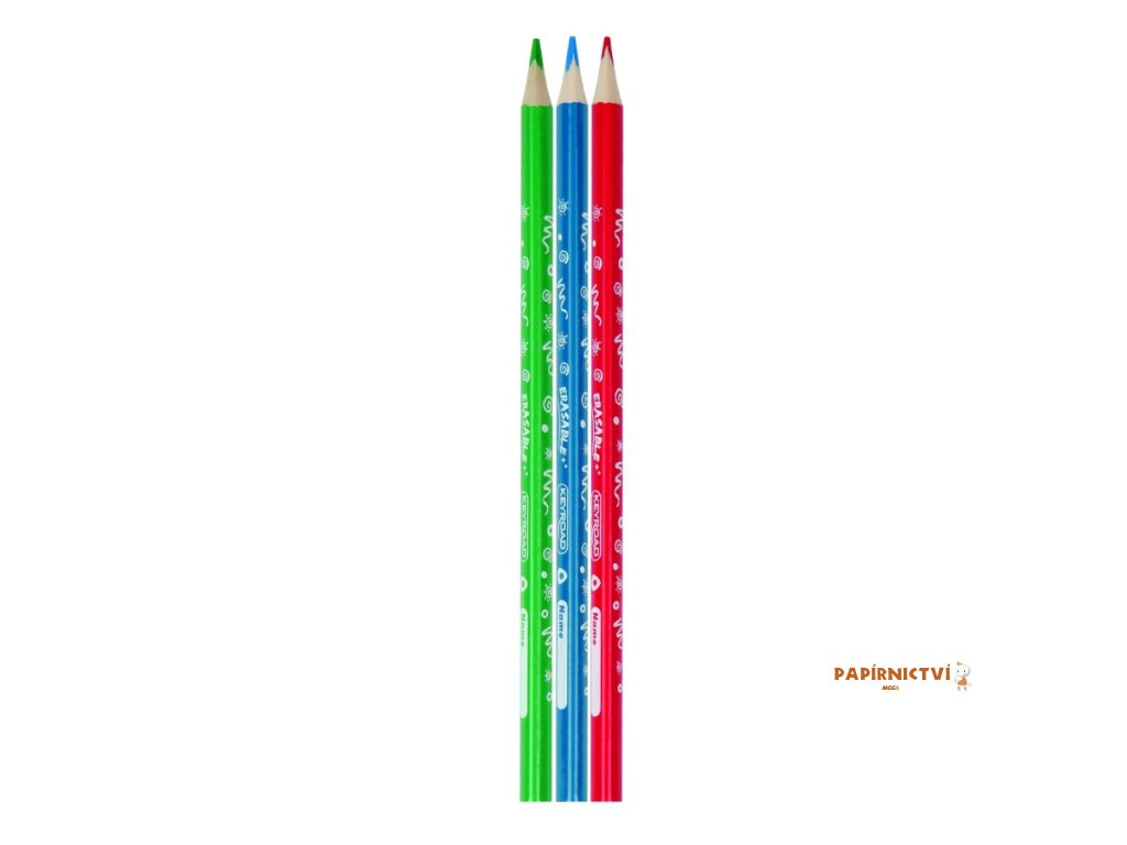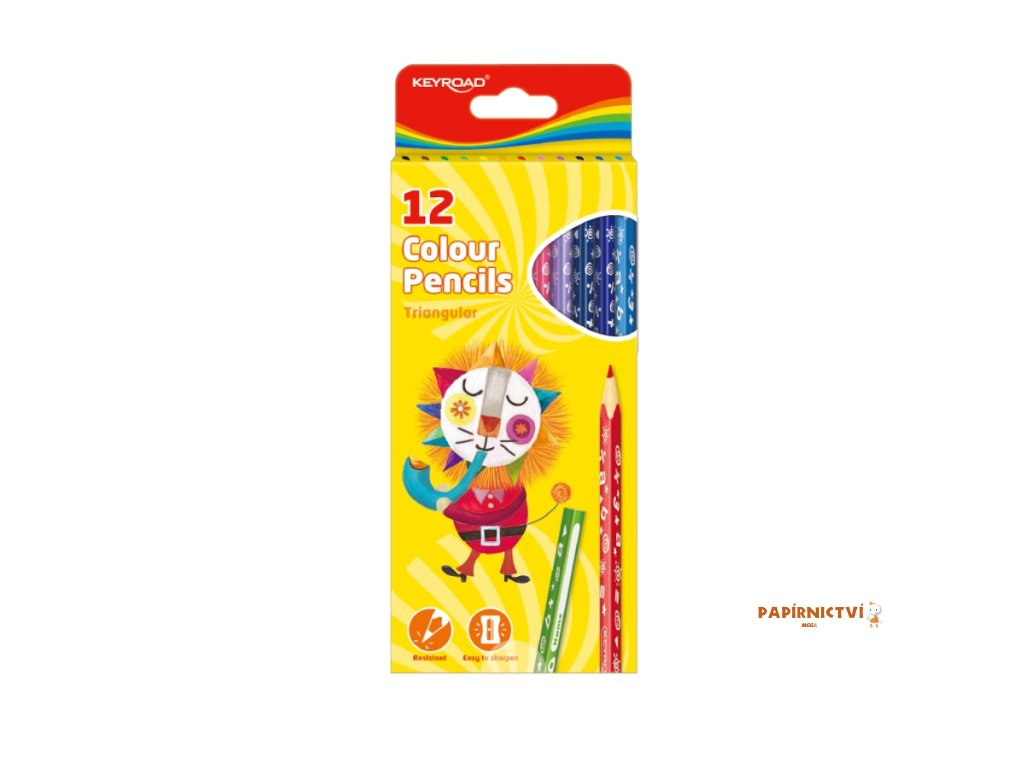 Školní pastelky trojhranné, 12 barev. Dřevěné, lakované. Průměr jádra 3mm. Syté a zářivé barvy. Odolné proti nárazům. Dodávané v papírové krabičce. Na pastelce je volné místo pro zapsání jména.