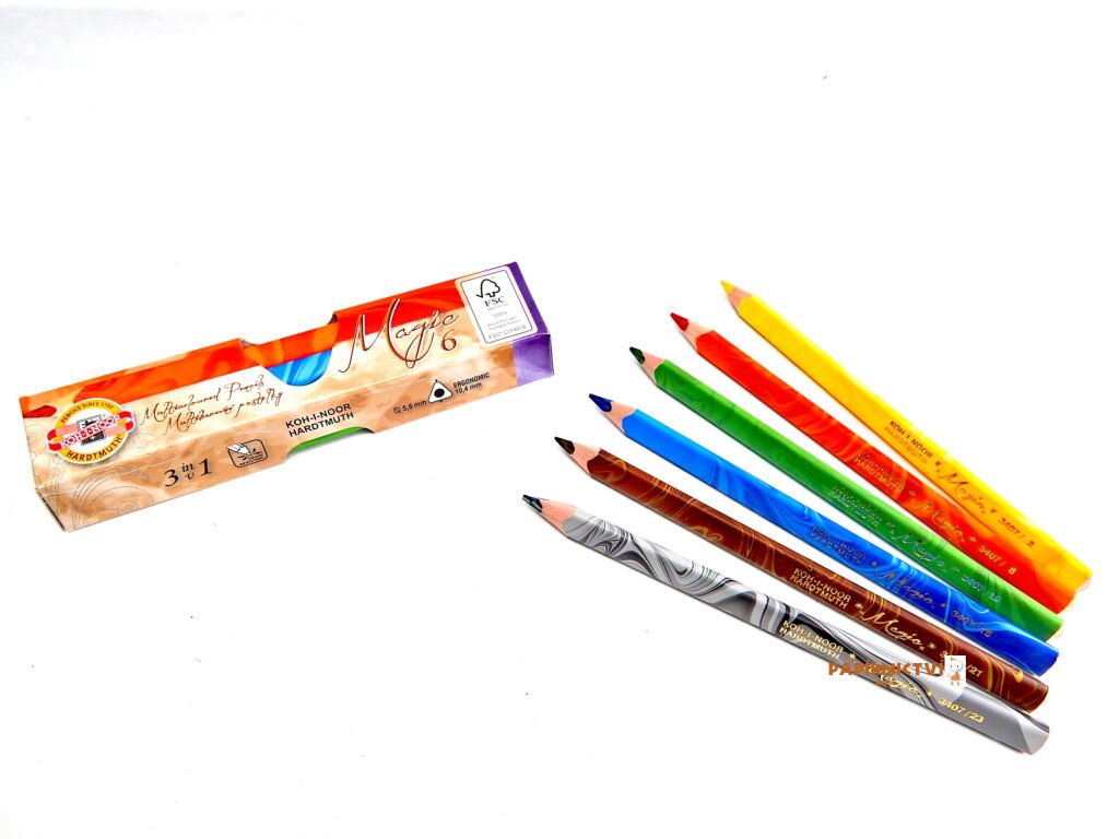 Úžasné trojhranné pastelové tužky MAGIC v dřevěném plášti z certifikovaného dřeva FSC 100% se speciálním vysoce kvalitním tříbarevným jádrem – 3 odstíny barev v jedné tuze. Ergonomický trojhranný tvar umožňuje optimální držení a vedení tužky. Tužka vytváří vícebarevnou stopu, která se mění natočením hrotu. Jedinečná pro vybarvení větších ploch, na které se má střídat více blízkých odstínů např. tráva, moře atd. Pro dosažení barevného efektu za použití různých technik kreseb /stínování, šrafování/ je výsledný efekt kresby plastičtější než u kresby klasickou pastelkou.