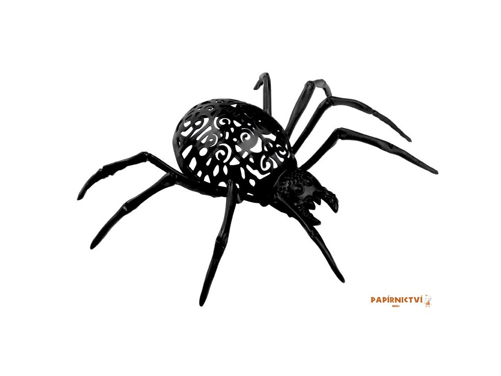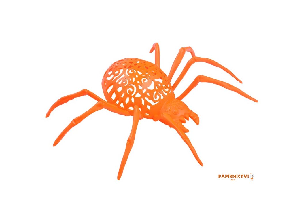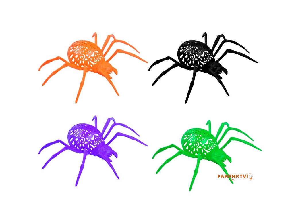 Karnevalový doplněk plastový pavouk v černé, oranžové, zelené nebo fialové barvě. Tato dekorace nesmí chybět na žádné halloweenské párty. Díky své velikosti budí pozornost a v mnohých vyvolává pocit strachu. Pavouk je vyrobený z plastu, díky tomu je vhodný jak do interiéru tak i exteriéru.