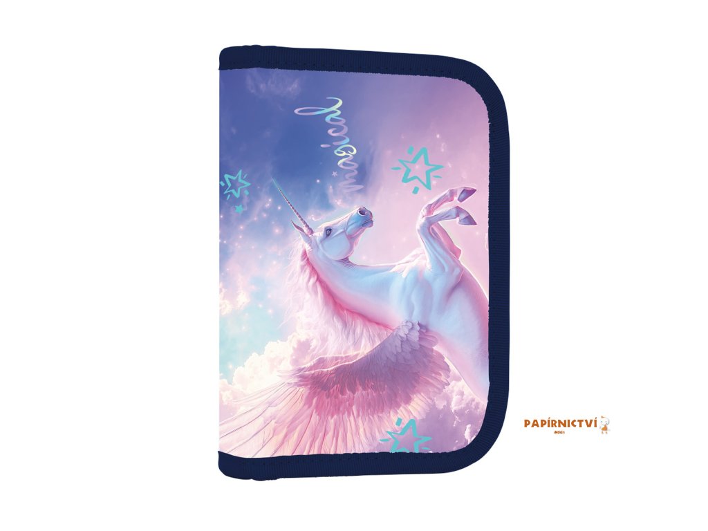 Jednopatrový školní penál s 2 chlopněmi, prázdný obsahuje 25 gumových poutek pro uchycení psacích potřeb. Na vnitřních chlopních jsou průhledné fólie pro rozvrh hodin..